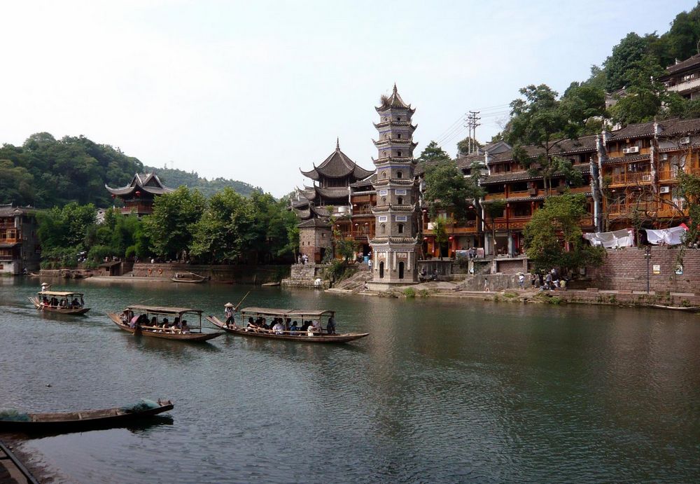 周辺景観との調和:万名塔は、虹橋や遐昌閣、対岸の吊脚楼群といった鳳凰古城を代表する風景と見事に調和しています。この一帯は古城の中でも特に絵のように美しいエリアとして知られています。