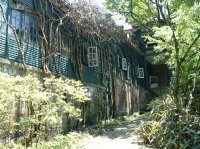 緑の扉や窓、壁を覆うツタなど、別荘全体が緑で統一された外観は印象的です。