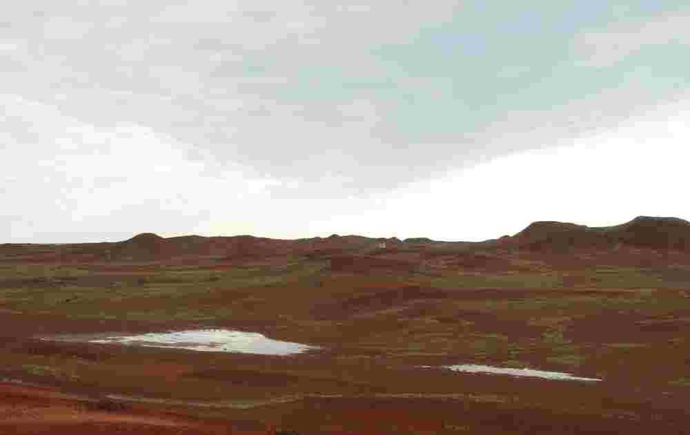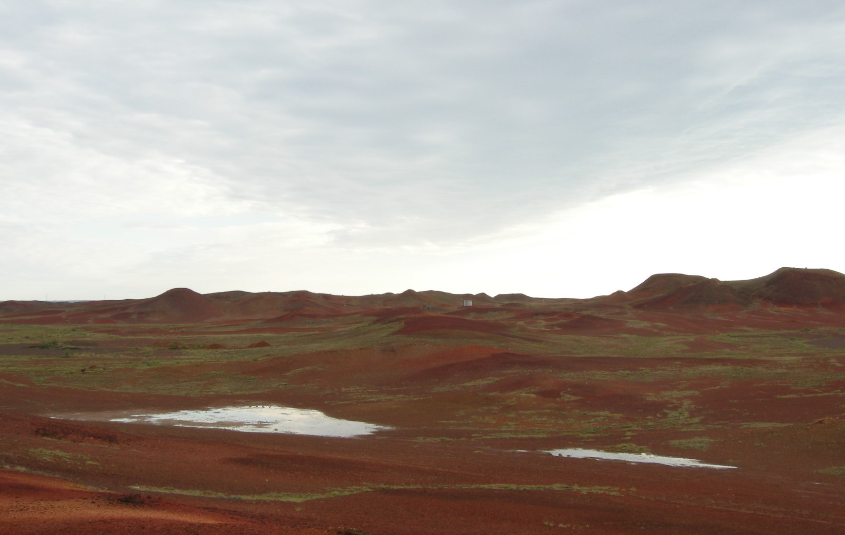 数百ものなだらかな円形の小山が連なり、太陽の光を浴びて一帯が赤く輝く壮大な景観が広がります。