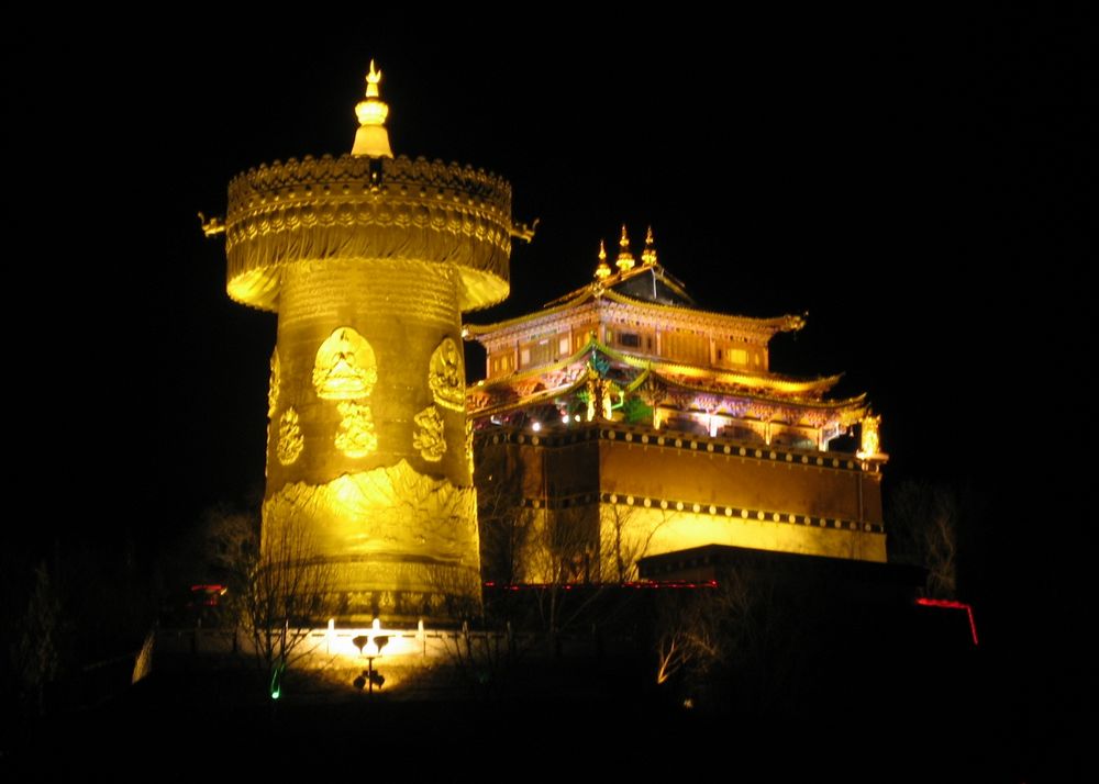 世界最大のマニ車:亀山公園の頂上に鎮座する黄金の大マニ車は、高さ約21メートル、重さ約60トンにも及び、三周回すと吉祥が訪れると言われています。